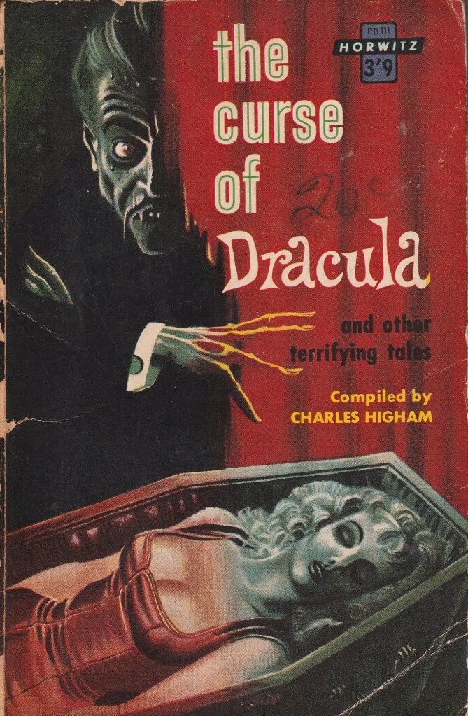 I have a huge fondness for this 1960 reissue of classic vampire, mummy and other horror tales from the pick of the c19th: Stoker, Gautier, de Balzac and Edith Nesbit all feature, along with HTW Bousfield and the American journalist giant and master of the satirical supernatural short, Ambrose Bierce. Published by Horwitz Publications in Inc in 1962, this collection has an astounding piece of cover art, making liberal use of colour coding and way-out fonts in its text and features an extremely slimy, sweaty Dracula reaching out an exceedingly creepy an d emaciated hand over an elegant coffin containing a stunning blonde in a red evening dress. Coming at the beginning of the sixties, this cover is disturbing, psychedelic and fun all all at the same time, exhibiting all the qualities of a decadent fever dream.