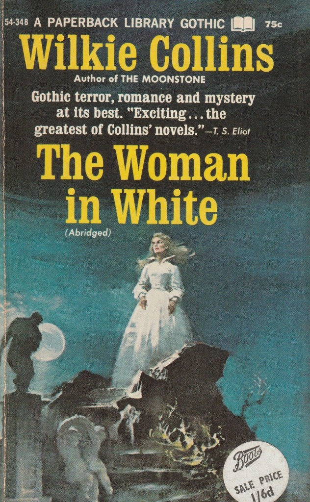 Wilkie Collins’s groundbreaking multi-narrative Victorian thriller The Woman in White (not to be confused with the Susan Hill novel The Woman in Black!), originally published in the good old days of 1860, here reprinted in 1966 by Paperback Library, over one hundred years later! Proudly proclaiming its status as a ‘Paperback Library Gothic’ (along with a load of written-for-the-market chintz that would have accompanied it at the time), this stunning edition features one of the gorgeous full-colour paintings that graced this series. Amazingly, it still has the 1/6 d sticker from Boots (at a time when they sold actual books!) on the bottom right of the cover. Abridged as it is, I absolutely love this version, and think you will too.